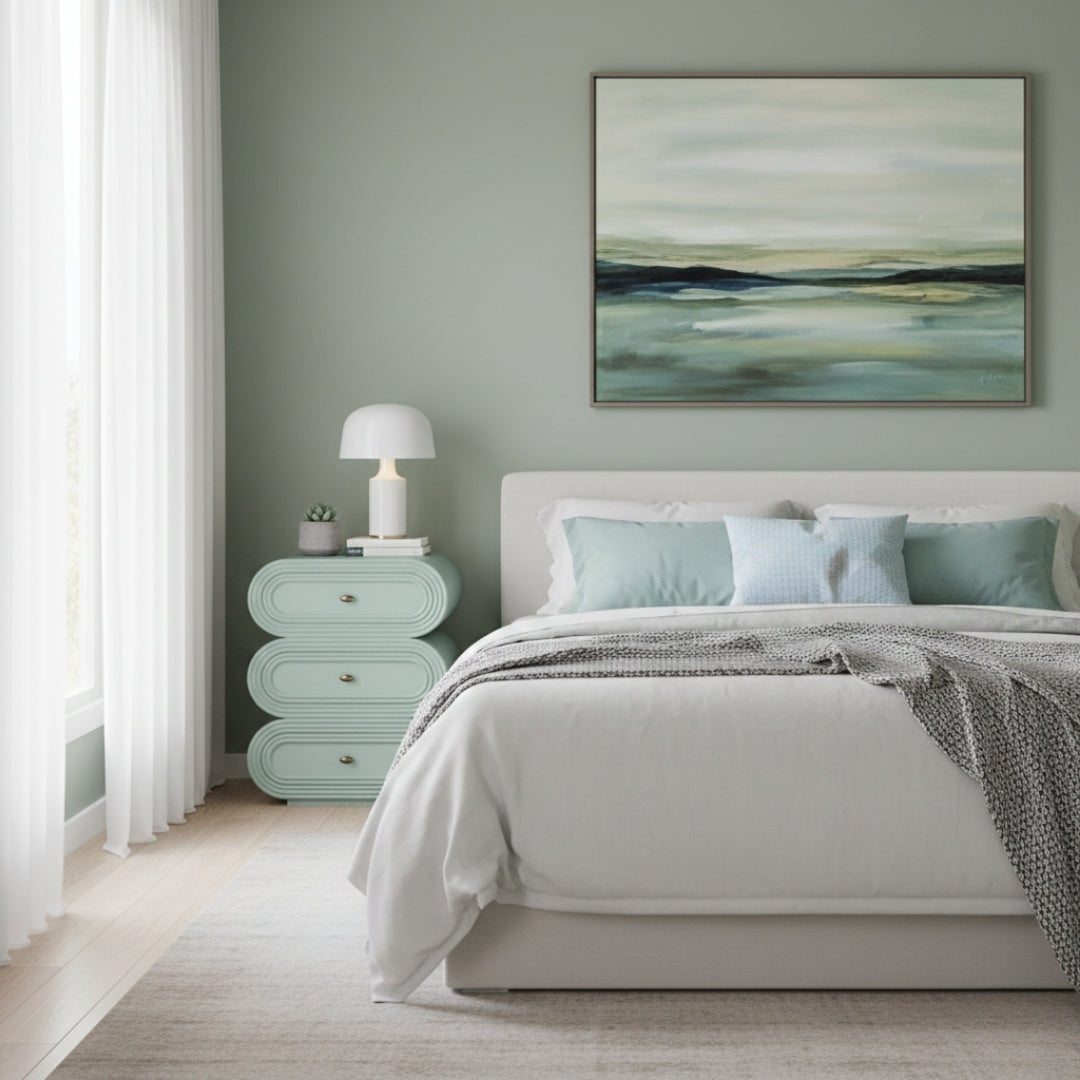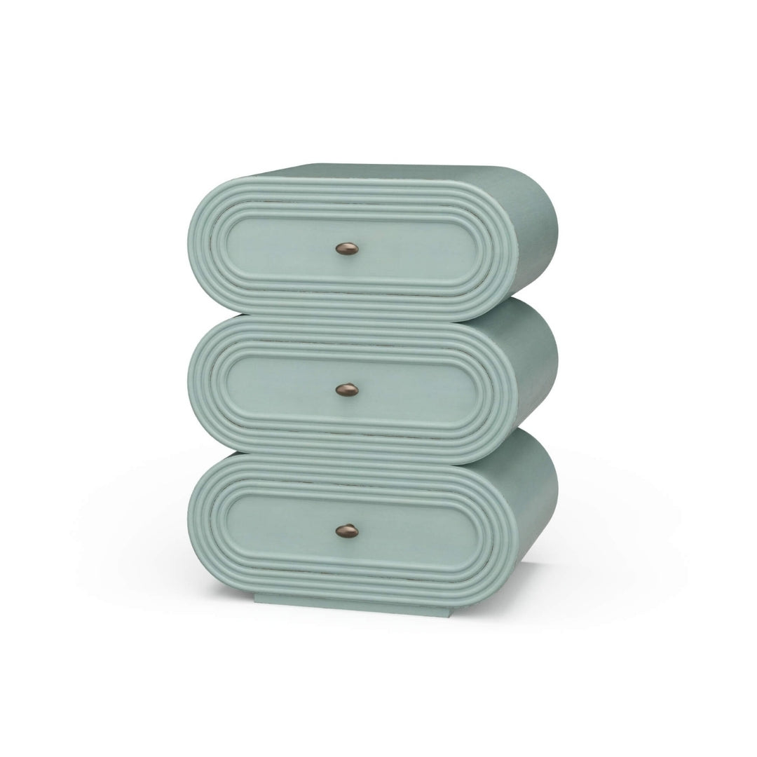 Fabricada en madera maciza y terminada a mano, incorpora tres gavetas que ofrecen almacenamiento práctico para objetos personales, manteniendo una estética limpia y ordenada. El acabado Dugg Egg Blue, delicado y sofisticado, aporta frescura y carácter al espacio, funcionando tanto en ambientes contemporáneos como eclécticos o costeros.