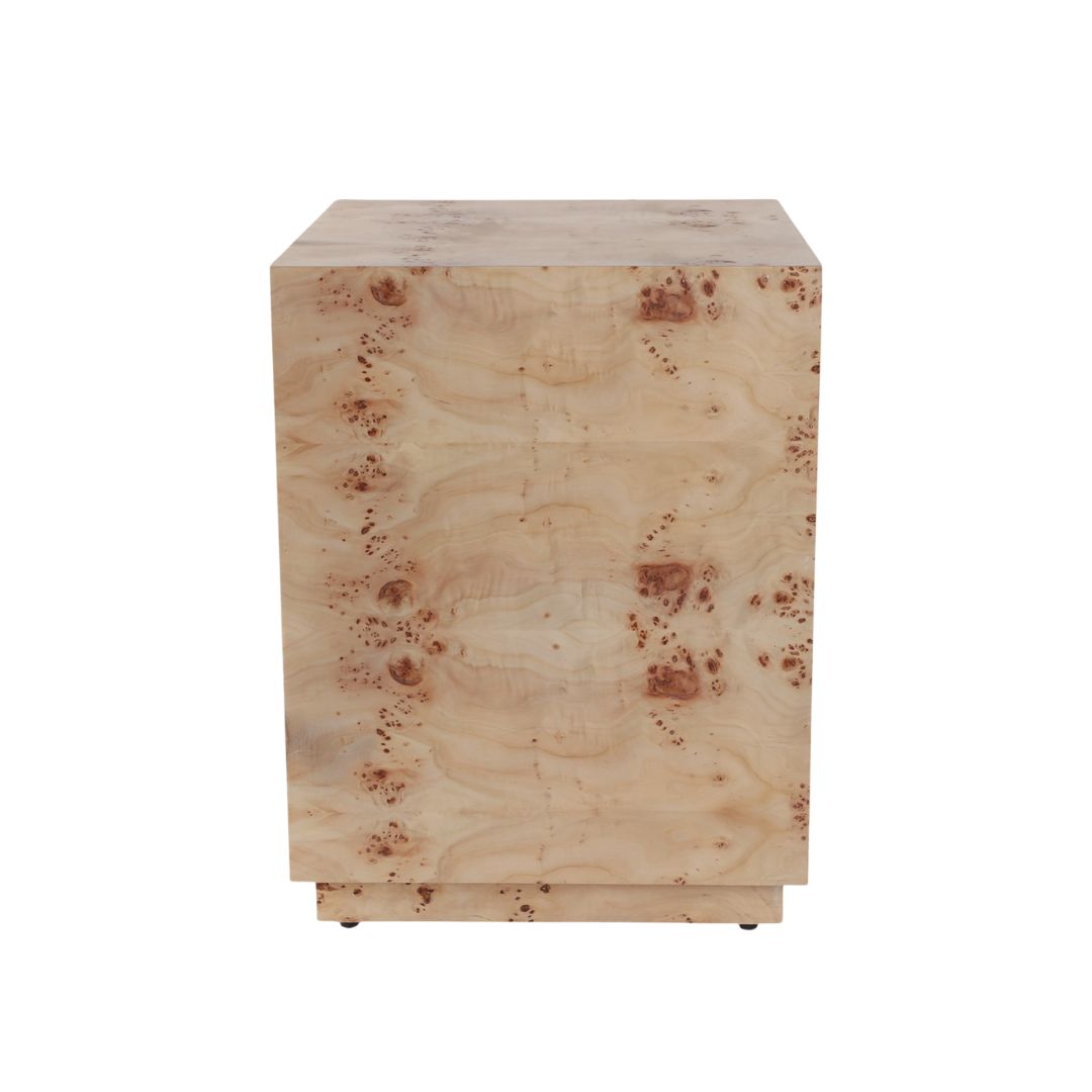 Mesa auxiliar de bloque sólido con acabado en madera burl en tonos tan, que aporta textura natural y sofisticación discreta a cualquier ambiente interior. Su diseño robusto y orgánico hace de esta pieza un acento decorativo ideal junto a sofás, sillones o en rincones de sala y recibidores, aportando calidez y carácter sin competir con otros elementos de mobiliario.