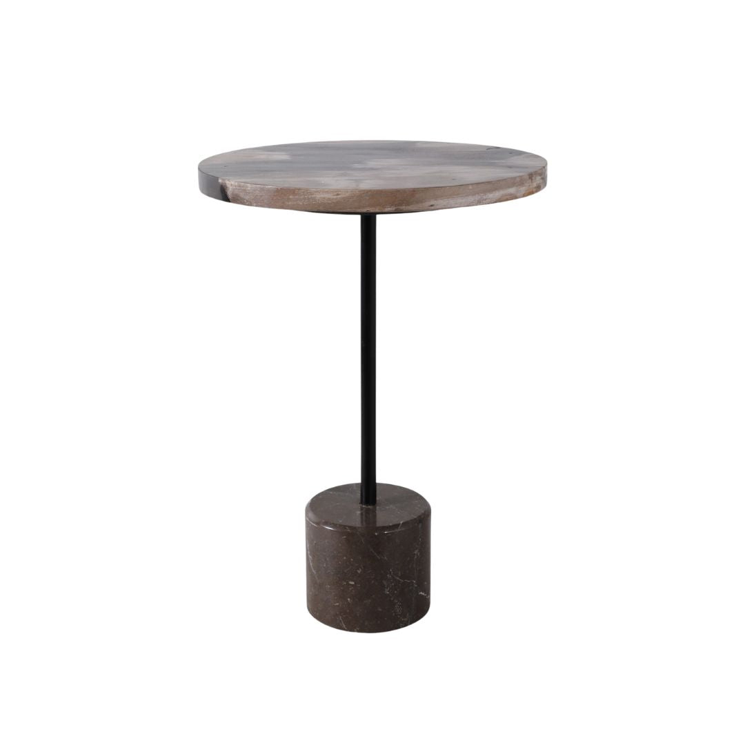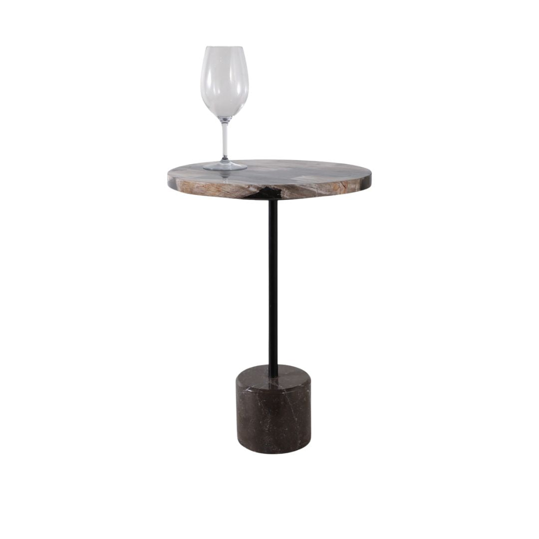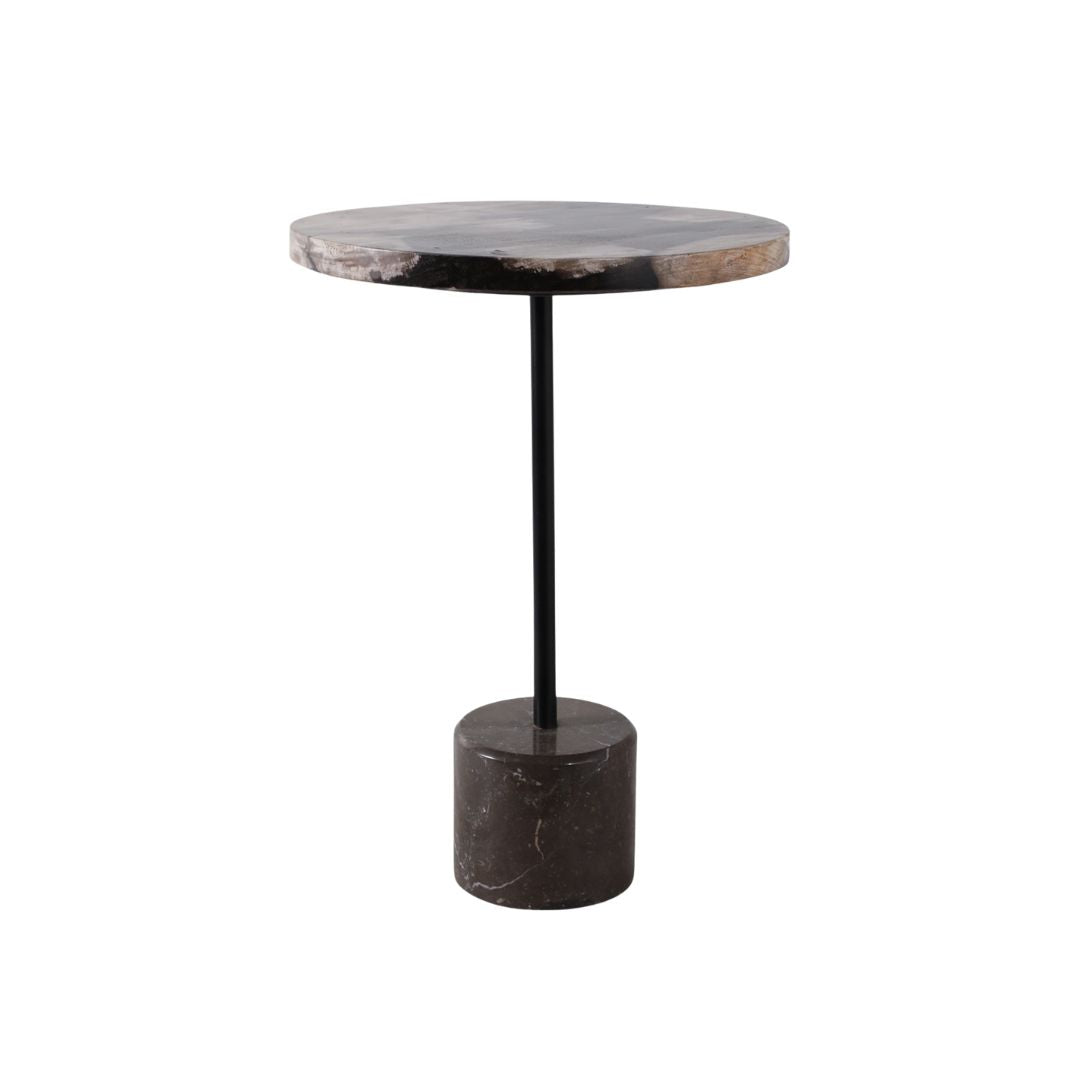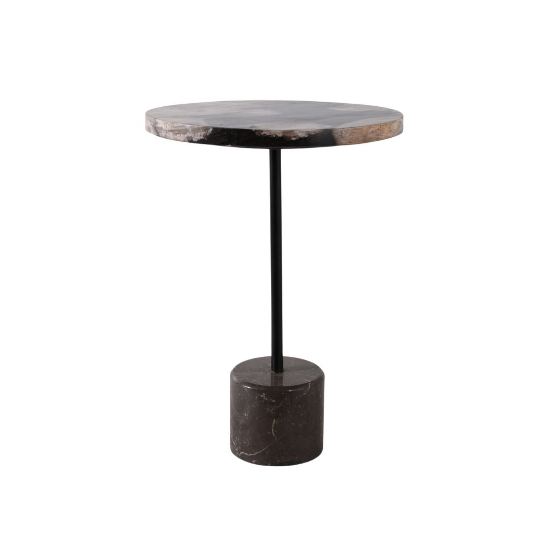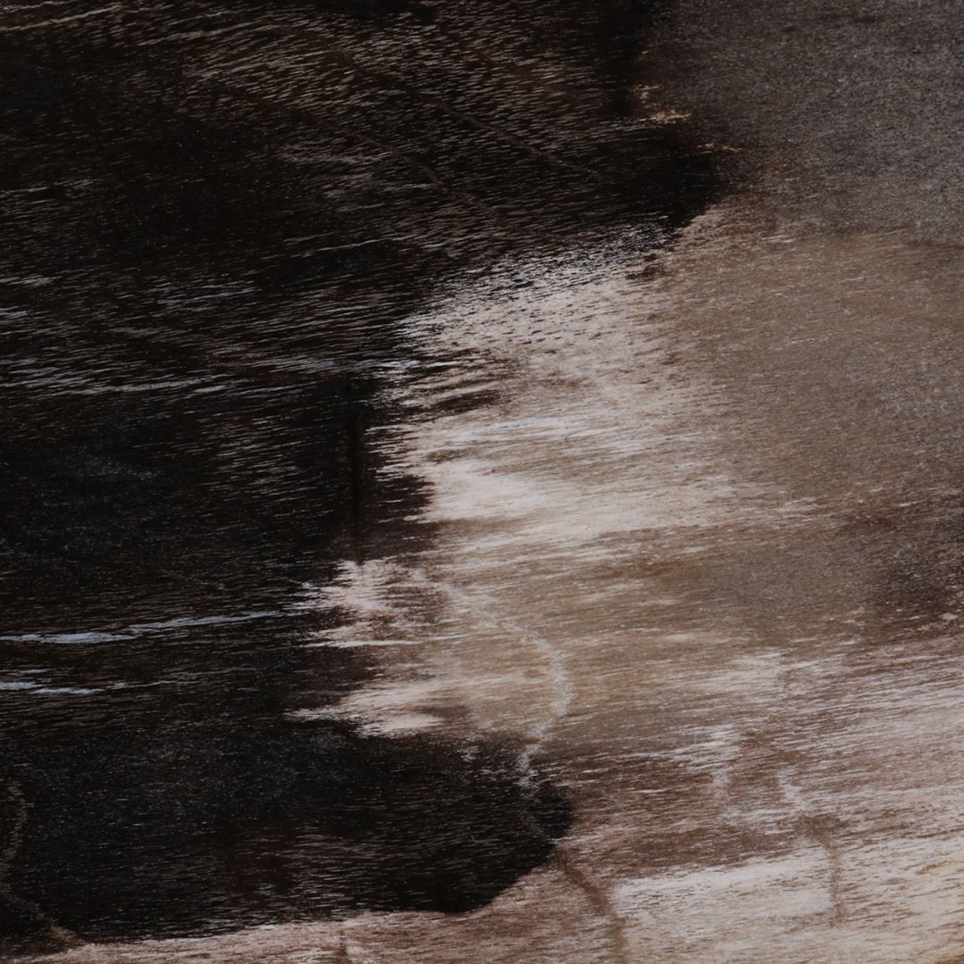 Mesa auxiliar con superficie de madera petrificada y acabado en tonos negro y tan, que aporta un estilo natural, orgánico y sofisticado a cualquier espacio interior. Su presencia combina la rusticidad de la madera fosilizada con un diseño contemporáneo, convirtiéndola en un mueble decorativo perfecto junto a sillones, sofás, en recibidores o rincones especiales.