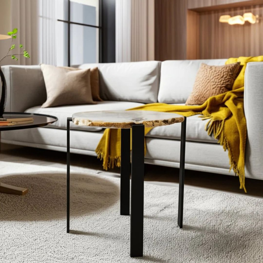 Perfecta como mesa de apoyo o acento decorativo en salas, recibidores o espacios modernos que buscan un toque natural y distintivo.