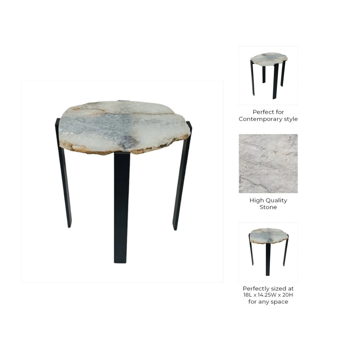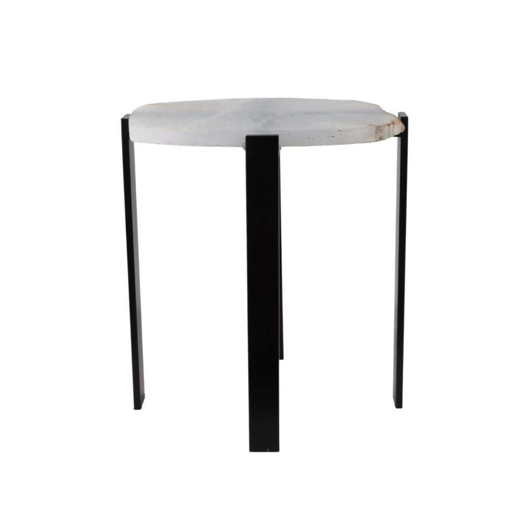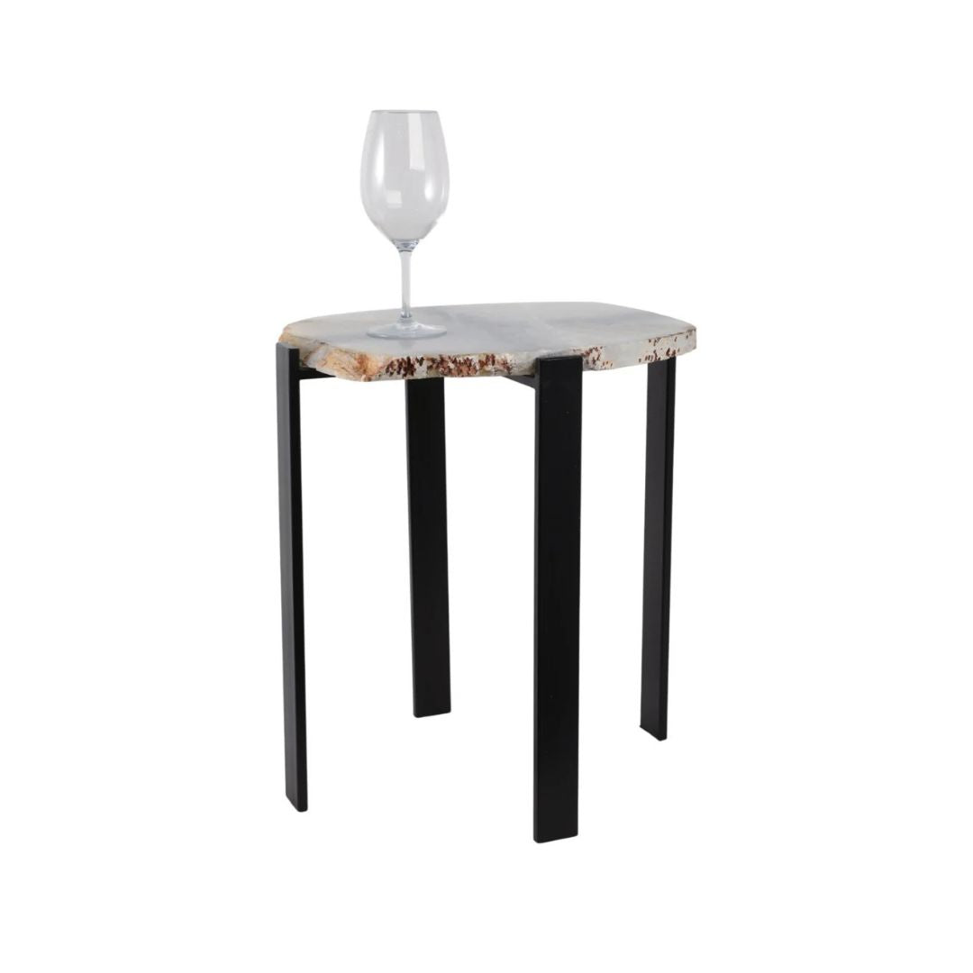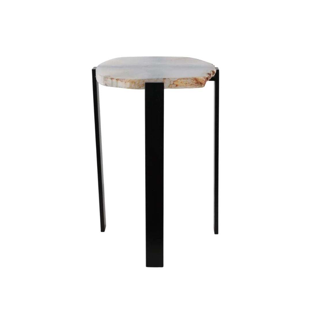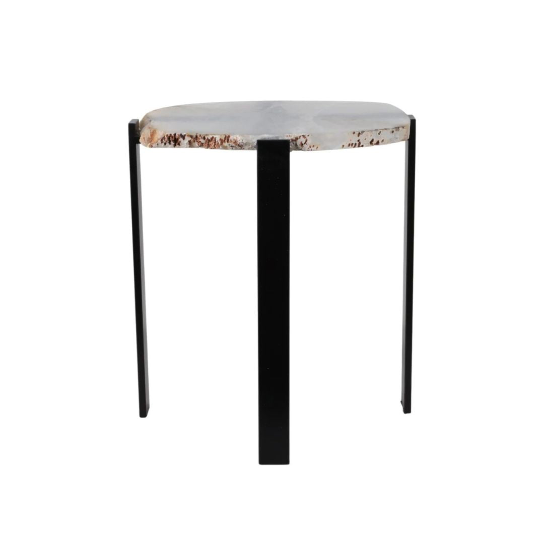 Mesa auxiliar con superficie de ágata natural, destacada por su borde orgánico sin pulir (raw edge) que conserva la forma auténtica de la piedra. Los contrastes entre tonos blanco y negro crean una pieza sofisticada, elegante y única, ya que cada mesa presenta vetas y contornos diferentes.