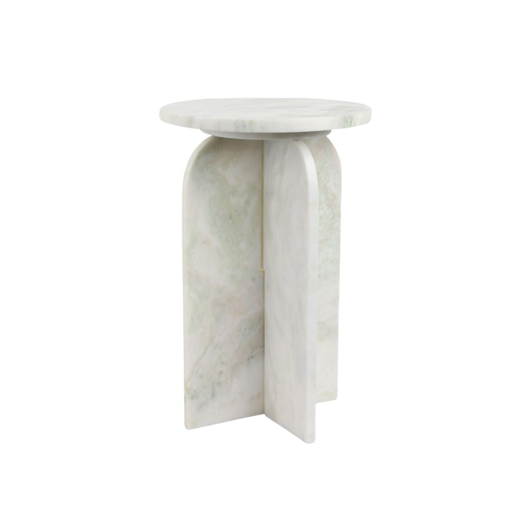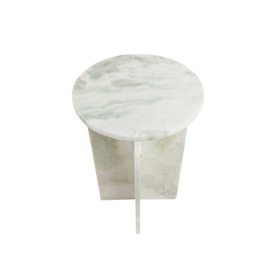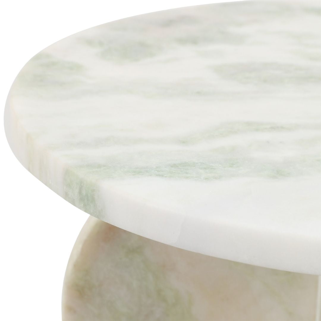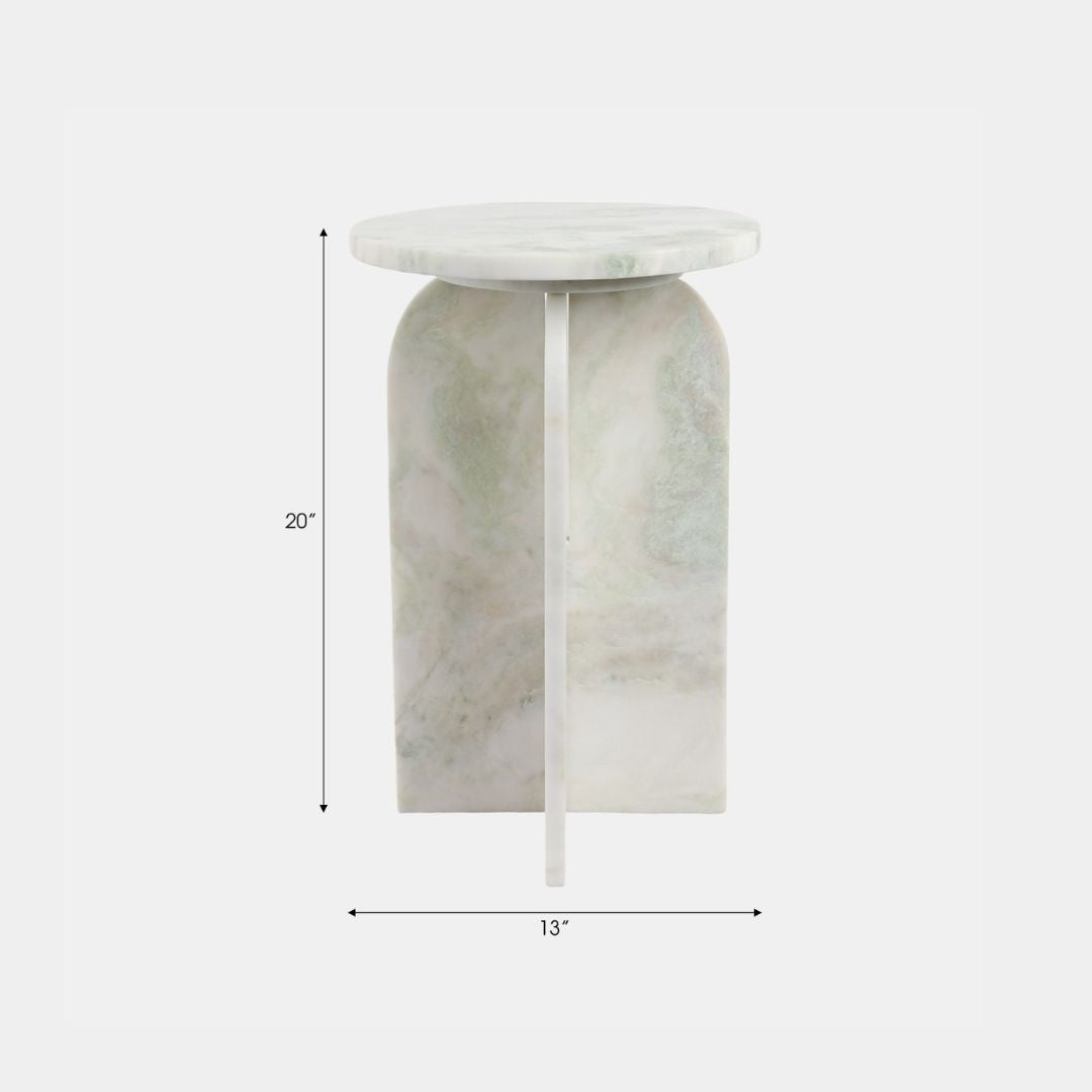 Mesa auxiliar compacta y elegante con superficie de mármol natural en tono verde claro, ideal como pieza decorativa o mesa de apoyo en salas, recibidores o habitaciones. Su diseño redondo y minimalista aporta un toque sofisticado, combinando la belleza de la piedra con un estilo moderno que se adapta a diferentes ambientes.