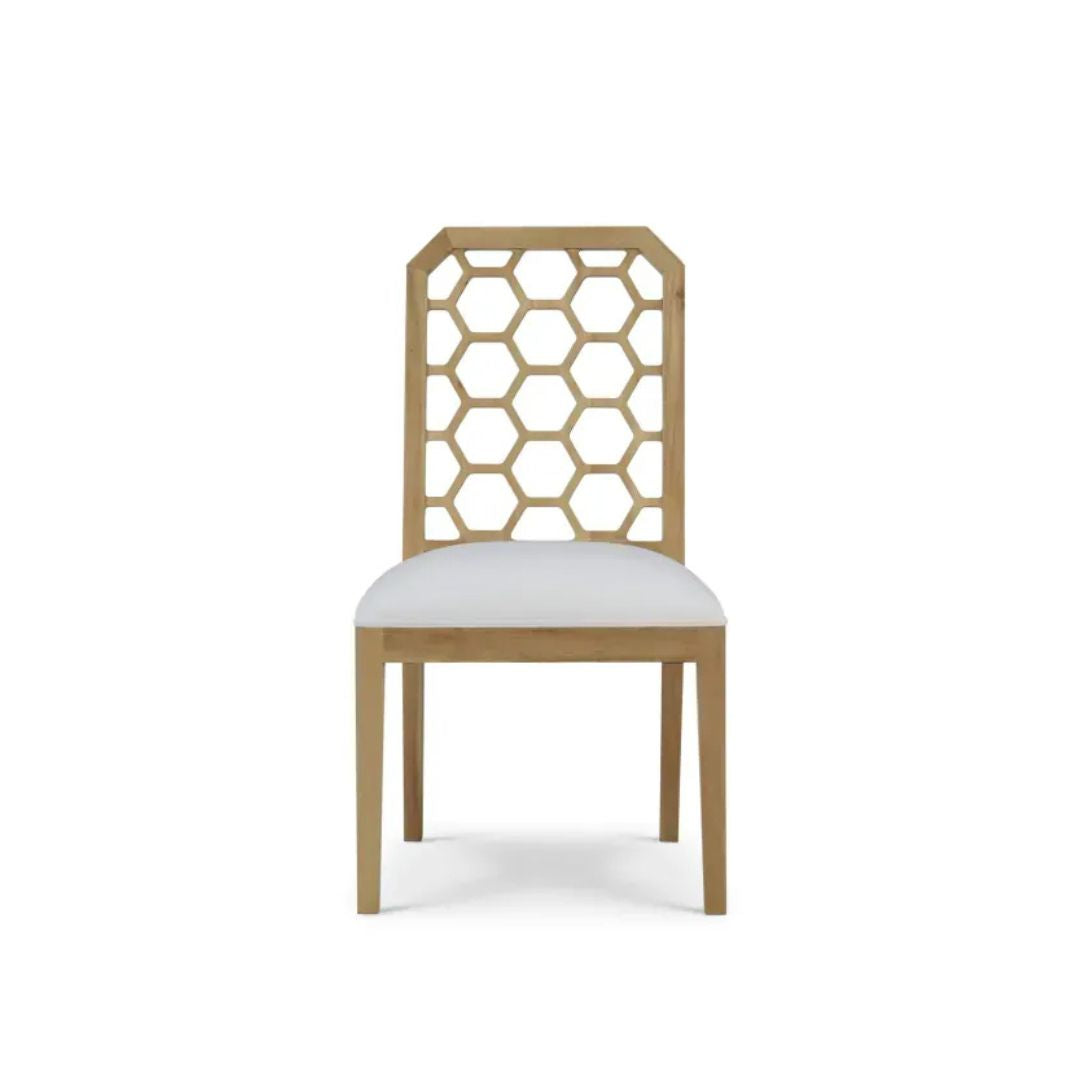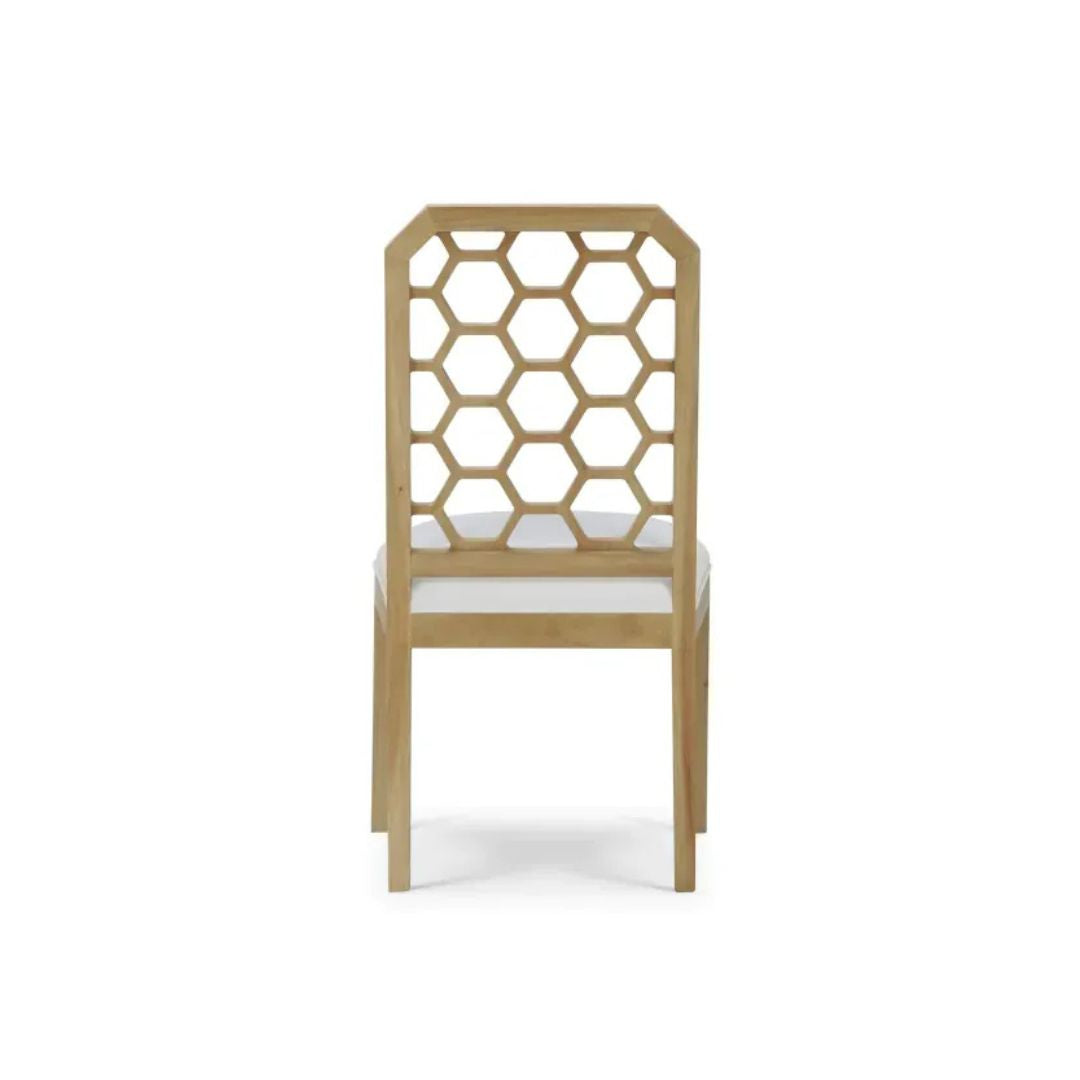 Las sillas Ceylon complementan el conjunto con su respaldo geométrico decorativo y asiento tapizado en tela clara, aportando confort y ligereza visual. Un juego pensado para crear un ambiente acogedor, funcional y atemporal.